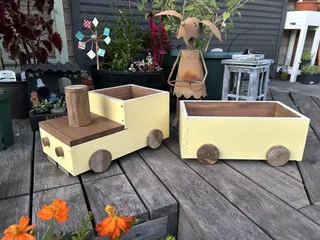 汽車型プランターカバー できたてほやほやの汽車型プランターカバーです。夕方の薄暗くなった庭を明るくしてくれます。ウォルナット塗装後にミルクペイントのハニーマスタードを2度塗りしました。