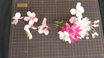 今の時期、100均には色んな桜の造花があるんですけど意外にも花が小さいのが無いんですよね。 ましてや橘の造花は無かったのでそれっぽいので代用しました。