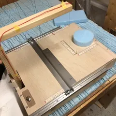 ようやくスチロールカッターが完成しました。2歩後退、1歩前進の牛歩の歩み。長かった~。(´;ω;`) フェンスに板を乗せると、断面は次のようになります。これでズレたりしないかな。円形に切り出す際のピンは、竹串を使いました。 ■使い方板を外します。フェンスを移動させます。今回は幅5