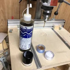 金属を加工する際に切削油(カッティングオイル)を塗るわけですが、ポタッと垂らすと量が多すぎます。そこで切削対象の材ではなく、ドリルのほうに塗ることにしました。100均の化粧品のコーナーに使えそうなものがあったので仕入れてきました。左のパウダーポットは、スポンジを容器の中へ入れてしまい、切削油で濡らし