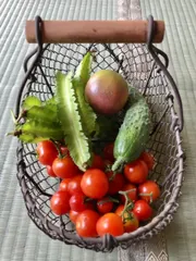 今朝の収穫 久しぶりに色んなものが採れました。シカクマメ、キュウリ、ミニトマト、そしてパッションフルーツ。パッションフルーツは採りごろになると勝手に落ちてそれを追熟させるんだって聞いてたんだけど、ホントに今朝落ちてた!考えてたのより青いんだけどこんなものなの?これ、うっかりしてたらアリとかダンゴムシに味見される