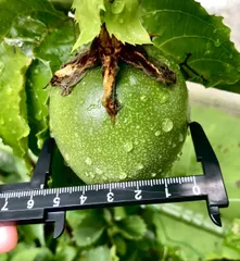 ノギス大活躍 パッションフルーツ、こんなに大きくなりました〜。毎日のように花は咲くんだけど結実したのは最初の4個だけ。暑すぎるのかなあ🥵シカクマメも花は次々咲いてるんだけどみーんな落ちちゃう。ググったところ、こっちは暑さから身を守るために花を落としてるんだって。さて、カインズさんから種をいただいたコールラビもこん