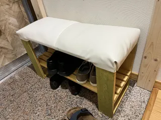 以前にWSで作ったベンチ。座り心地が悪いと子供らに言われたので、改善してみました。 100均で合皮の端材とクッションの中身を購入して作りました。 座り心地は良くなりましたが、子供らが座ってくれるかどうか...w端材の長さが足らなかったので、ミシンで縫って裏側にタッカーで留めただけ