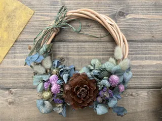 青アジサイとシダーローズのリース♪ 庭の花をドライフラワーにして、リースを作りました☺️シダーローズと合わせてみましたよ。