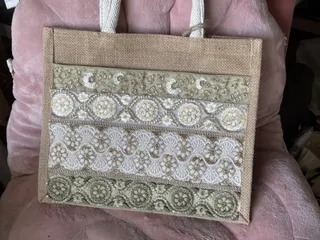 インドリボンのジュートバッグ♪ ジュートバッグに好きなリボンを選んで貼り付けて。とっても素敵なバッグになりました。裏側も可愛い💕