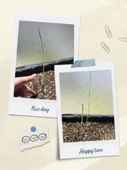 ベランダ菜園2025(アスパラガス_④2本目、ぐ〜ん!と伸びる♪) 画像の左が5/4、右が今日です♪一気に倍以上の長さになりました!ちなみに、1本目を食べようとしてましたが、無知な野望でした😂🔰なので何もかも初めてで楽しいです🎶