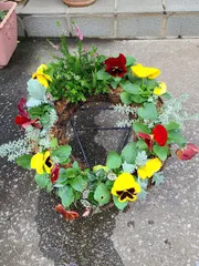 ハンギングリース パンジーのハンギングリースを作りました🎵いつも作り終えてから気になる所を発見してああすれば良かったと反省してしまいます💦