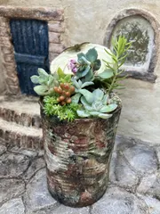 リメ缶を作りました。 お友達からとても素敵ナプキンペーパーを頂きました。リメ缶に使おうと作りました😊空き缶にボンドを薄めたものを塗りその上からペーパーを載せました。乾燥後汚しを入れて上からニスを塗りました。その後多肉を入れて完成しました。リメ缶作り楽しい時間でした。