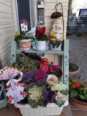 お正月バージョン 葉牡丹の寄植えと百均のお正月飾りで玄関前を飾ってみました😊上の段の小さな寄植えはカインズさんでお得なお正月寄植えです❣️WSの帰りに買ってしまいました😀