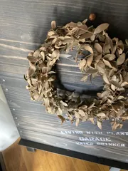 リース 自宅の庭でとった、ユーカリの葉をリースにしてみて、ドライに。何ヶ月もたってるのに、いい感じ!
