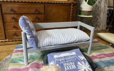 古いテーブルをワンコのベットにリフォームしました。喜んで寝てくれます。