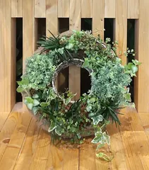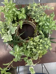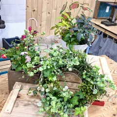 『植え替え講座』でリースの寄せ植え🌱 今回初めて、GWSの「植え替え講座」に参加しました。この講座は、自宅で使っていない鉢を持参し、寄せ植えしたいイメージを先生に伝えます。その後、グリーン売り場に行き、鉢のサイズに合った苗の数や寄せ植えのイメージに近いお花を教えて頂き、各自好きな苗を選び実費で購入します。私はリースを持参し、グリーン系の