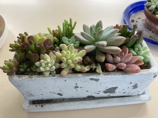 多肉寄植え 昨日、ぱみこさんの作品投稿を見て、「わたしも多肉のメンテ!!」と思い、早速実行しました徒長した子の上部を切って植えつけ、隙間には葉挿しで育てて夏を越した子で埋めてみました うまく育ちますように…🙇