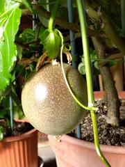 パッションフルーツ 17個実っている実の1つが色づいてきました😊🎶今年は暖かいので熟すのが早いかもしれません😉💕🎵