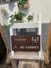 看板付き鉢置きスタンド🪧 今日はMyストアで看板付き鉢置きスタンドを作ってきました🪧またまた考えていた色と違う色にしてしまいました😅ステンシルも相変わらず下手くそで…孫達と大差ない感じの仕上がりです💦💦今後もめげずに頑張ります❣️😊