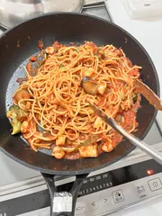 家で収穫した🍆と🫑と🌿で 家で収穫したナス🍆とピーマン🫑、バジル🌿でパスタ🍝を作りました。 ナス🍆は夏にもかなり収穫していましたが、ここに来てまた再来です。クリアランス30円苗だったので、十分過ぎるほどに元は取れましたwピーマン🫑も同じく。 収穫した野菜以外には冷凍ブロッコリー🥦にシーフードミックス🦐にト
