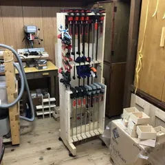 クランプラック(リニューアル後) 手持ちのクランプが増えてきて散在しているため、クランプラックを改良することにしました。1×4に切り込みを入れて、クランプを引っ掛けられるようにしていきます。7本引っ掛けられるようにしました。7本の理由は備え付けの棚の奥行きと同じくらいになって、木粉を被ることなく収まりそうだったからです。