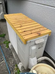 先日作品投稿(リンク→ https://diy-square.cainz.com/announcements/lj3aa2jqztu1mr3f )した室外機とは別の室外機です。こちらのエアコンは、稼働率が非常に低いので日除け対策はしない事にしました。すのこ状に天板を組んで、植木鉢を置いたりできれば良