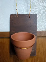 皆様だったらステンシルや、鉢にデコレーションしたりして、それだけでも美しく飾られるのでしょうが、私には才がありません… 100均の、3個セットの植木鉢を端材と針金を使ってホルダーにしました。これも、お花屋さんで買うと結構なお値段になりますよね、 端材に塗った塗料は屋外OKなので、