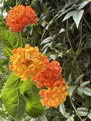 ランタナ 去年購入して、2年目の鉢植えのランタナです。去年は日当たり良いお庭で密集して沢山咲いていたのですが、今年は花数少ないです。玄関の軒下に置いているからかも?