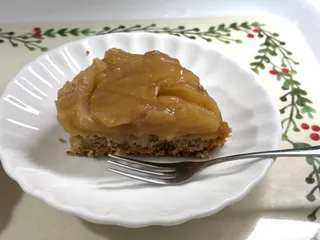 アップサイドダウンケーキ♪ クッキングファンで作ったアップサイドダウンケーキ🍎美味しい〜シナモンとメープルが効いていて。これはまた作ろう!一晩寝かせたもの。しっとり〜 先生の焼きたて焼きたての方がふっくらしてるわね。