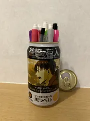空き缶のペンスタンド 今年の4月に発売されたサッポロ黒ラベル「進撃の巨人」デザイン缶。 何気なく行ったスーパーで見かけた時は、その日の買い物予算をぶっ飛ばして「買うしかない!」の一択でしたが、飲んだ後のパッケージや缶をどうしていいかわからず、ずっと開けられず、飲めずにいました。 そこでまた、リメ缶の達