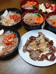 今日の夕飯 皆様お久しぶりでございます😊また初めての方は、はじめましてでございます🙇♀️毎日暑い🥵日が続いていますね💦今日も暑かったので夕飯はキムチ冷麺とビビンバとタン塩焼きを作ってみました