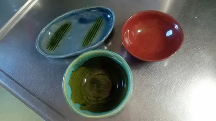 陶芸教室にて その1 以前住んでいたところで作ったものです☺️右上の赤い小鉢は先生に教わりながら作ったので薄く、手前の緑の小鉢は自分で作ったのでだいぶ厚くなりました😊小皿は余った粘土をみんな使いました✨それぞれ釉薬の色を選べてあとは先生が焼いてくださり、焼き上がりを受け取りに行きました😊一人での参加でしたが夢中になり楽し