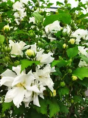 八重咲の木槿の花 夏に花が咲いた後、強剪定をしたら新たな花が以前にも増して咲き乱れています。びっくり(・・;)