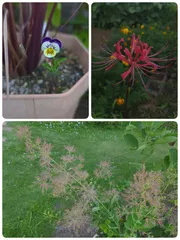 あれ…?今で良いの? ビオラ・彼岸花・スモークツリー。今ウチの庭で咲いてますが…ちょっと(ビオラに関してはだいぶ)時期を間違ってるような気がします😅
