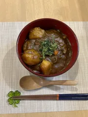 今日はカレー丼です。普通のカレーより味が和風よりなので、どんぶりです。 カレー(ライス)の翌日は、カレーうどん…っていうのはよくある話ですが、1日目のカレーを第一段階とすると、 このカレー丼、カレーとしては今日が1日目なんですが、実は昨日は別の料理で… そう、肉じゃがで