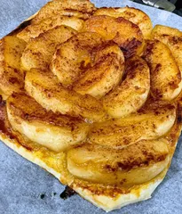 今朝はノンビリ朝食です。酸味の足りないリンゴにたっぷりレモン果汁を足し、リンゴの並べ方をも変えてみました。😊 生地破片を集めて、味塩パッパッソルトパイです。😊いつもは焼き立てをクッキングシートごと盛り付けるのですが、生地サクッとの為にクッキングシートを外してケーキクーラーに乗せてみました。心持ちサク