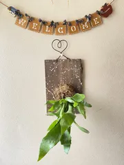 コウモリランの板付け 午前、ミントさんが参加したWS、午後の部に参加してきました。水苔を水糸で巻き付けながらタッカーで止めるのですが、悪戦苦闘😰でも満足な出来上がりでした。私はフックのところ、ハート♥️にしました!(ちょっと目立ちませんが😓)