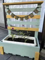 屋根付きしましまプランター ✨のその後 先週、孫息子と作った屋根付きしましまプランター に種から育てた千日紅を植えてwelcomeのガーランドをつけてみました❣️せっかく作ったのにしまっておくのはもったいないのでお庭デビューさせてみました😁