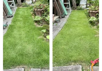 芝生刈りました(昨日の続き) 暑さを言い訳にずるずる伸ばしてた芝生刈り、昨日はDIYトークにやるぞ宣言したおかげで1箇所だけ出来ました。今日は暑くなる前に残りをやっつけてやろう!ウチの庭には4か所芝生のエリアがあるんですけど(赤で囲んだ所。)昨日やったのは左上の所だけ。アイキャッチは画像上側の所です。左がbefore。右がaft