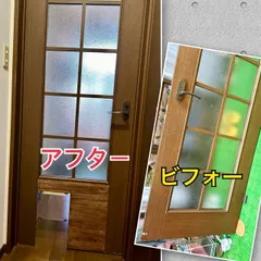 老犬なのでペット扉を作りました 可愛いワンチャンはトイレに行く際に人間用の扉を立ち上がり押して開けています、でも最近は老犬なのでしんどそうでした、後閉める事が出来ないので「寒いよー閉めてきてよ」とワンチャンに言ってます😔😆なのでやっと作る事にしました💪ガラスカッターを購入して初めて切ってみました、傷を付けたライン半分位から逸れて割