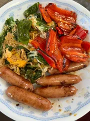 バジル あまりおしゃれじゃない大皿盛りですが、バジルの卵とじとパプリカとソーセージ炒め。 庭の水やりついでにバジルを切って台所でむしりました。連日の暑い日差しで葉が硬かったけど、採れたてで新鮮で体に良さそうな気がします。
