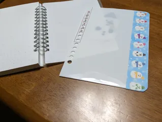 手帳用のポケットをクリアファイルで作成。どこにあるかわかりやすくするようにマスキングテープでマーキング。お気に入りがひとつ増えました。