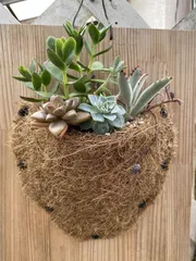 アレンジアワード2022 昨年植えたコウモリラン、冬越しに失敗して中を処分した後に残った手作りの板?ポケット?を再利用。挿し穂から育てた多肉に少しプラスして植え込んでみました。板は出来れば防水塗料を塗りたいと思いましたが、まだ手付かず…