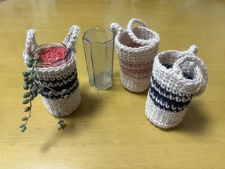 カップウォーマー カップウォーマーを編みました🧶デザイン編み方オリジナル(過去作)セーターのデザインです(腕と手があります)全面にポケットが付いていて、コーヒースティックが入れられます。画像が分かりにくくて残念。デザインはオリジナルではなく編み方がオリジナル