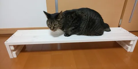 職場のパソコン用モニター台を作成。超撥水のホワイトで塗りました。木目もきれいに出て満足です🎵 我が家の猫が安定性を確認してくれました🐱