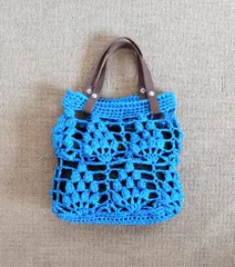 ↓4年前、初めて、かぎ針編みで編んだバッグです。テキストは紙の糸を使用していますが、私はスズランテープで編みました。表紙の作品とだいぶ違います…。4年ぶり、2回目のかぎ針編みをしました!紐の残りが少ないので、レシピを元に、模様1つ分減らしてみました。持ち手は編まずに、取り外しできる持ち手を付けました