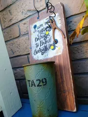 100均deハンギングタブロー缶✨ 100均の材料でハンギングタブロー缶を作ってみました✨ 材料これと写真ないけど、ワイヤーとトークでも何度か登場してる工具のキーホルダーを使いました(レモンとかセリアで売ってる) サイズだけで選んだらヒノキの板でした♥ダメージ加工で傷付けてみたらスゴイいい香り〜♥ダメージ加工でスト