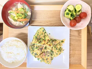 昨日はふわふわニラ玉と餃子入りスープとサラダ🥗で簡単に😊最近、レタスなどの葉物野菜が安くなってきて嬉しいです❣️