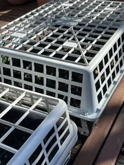 鳥よけ対策 すでにやっている方もいらっしゃるでしょうが。デッキで育てている「そら豆」の鳥よけ対策です。よく園芸屋さんでもらってくる籠を被せて針金でずれないようにしました。日当たりの良いとこへの移動も簡単です。この籠もらっておくと便利ですよ。重ねてしまえば収納スペースも取りません。
