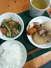 そろそろトウが立ちかけた「大阪しろ菜」をたっぷり使って野菜炒め、美味しかったです。今日は少しヒンヤリしたので、おでんも作りました。板コンニャクの在庫切れで糸こんにゃく使いました。コッチも味染みで👍