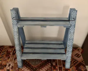 A型ステップラック 7月はじめに作ったA型ステップラック今まで見送ってきたのに急に作りたくなりました🤗持ち込みのくすみブルーがしっくりこなくてホワイトを上塗り、ブラウンで汚しを入れました脚に民族調のステンシル上段に落下防止のワイヤーを取り付け庭で使うつもりでしたが、同じような柄のゴザがあったのを思い出し和室に敷いてみた