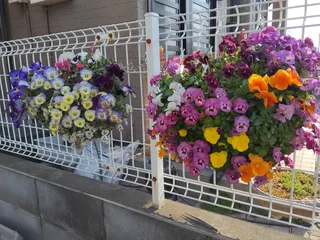 ハンギングバスケット 一ヶ月前に植えたビオラのハンギングバスケット花がたくさん咲いてきて、モリモリになってきました💞嬉しいです😊