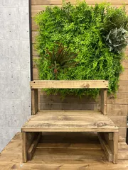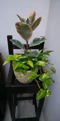 チェア型フラワースタンド ダークブラウンで作りました。 ゴムの木とポトスを2種類寄せ植えにしてみました。