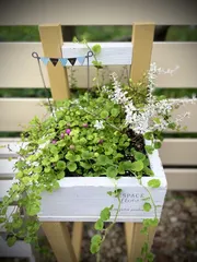 ガーデンスタンド塗り替えからの寄せ植え🪴✧ 以前WS作ったチェア型ミディアムガーデンスタンドは、サボテンの寄せ植えにしようと決めてステンシル🌵でも...いやいやサボテンをどうしたらいいか分からん🤷♀️💦挙げ句、庭にずっと放置。意を決して、再塗装と寄せ植え🪴1度塗りでは塗料はじく、色むら激しっ🥲見えない所は塗らない😆2度塗りでどうにか。その後